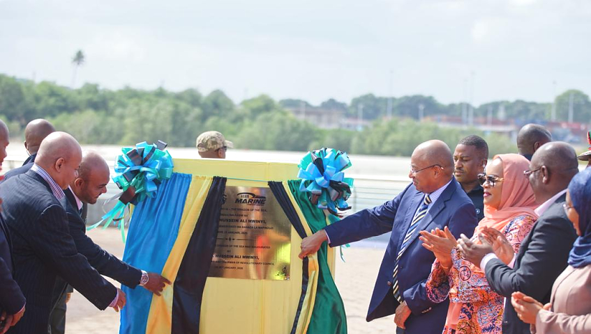 Rais wa Zanzibar na Mwenyekiti wa Baraza la Mapinduzi Dkt.Hussein Ali Mwinyi akiondoa Pazia kuashiria uzinduzi wa boti mpya ya Kilimanjaro 9 (Dragon of the Sea) inayomilikiwa na Kampuni ya Azam Marine Ltd, katika hafla iliyofanyika Mtoni Verde, Mkoa wa Mjini Magharibi.