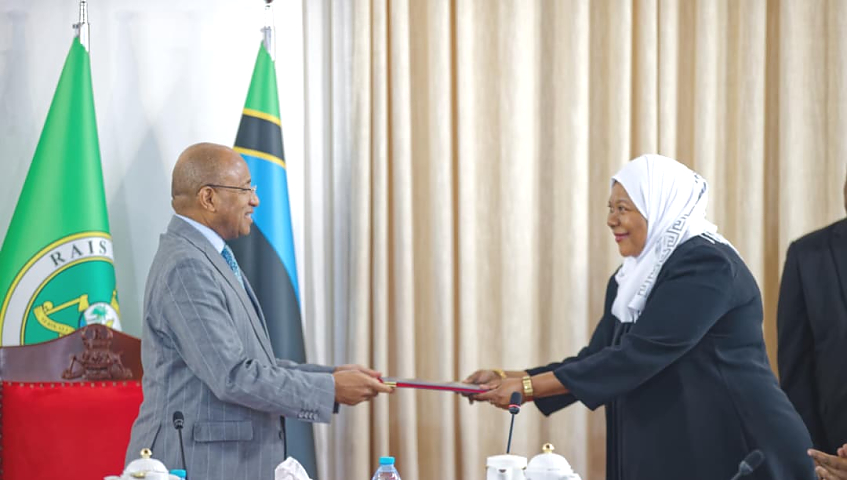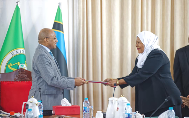 Rais wa Zanzibar na Mwenyekiti wa Baraza la Mapinduzi, Mhe. Dkt. Hussein Ali Mwinyi, akimkabidhi hati ya Kiapo Ndg. Amina Chande Muumini kuwa Naibu Mkurugenzi Mkuu wa Mamlaka ya Kuzuia Rushwa na Uhuju
