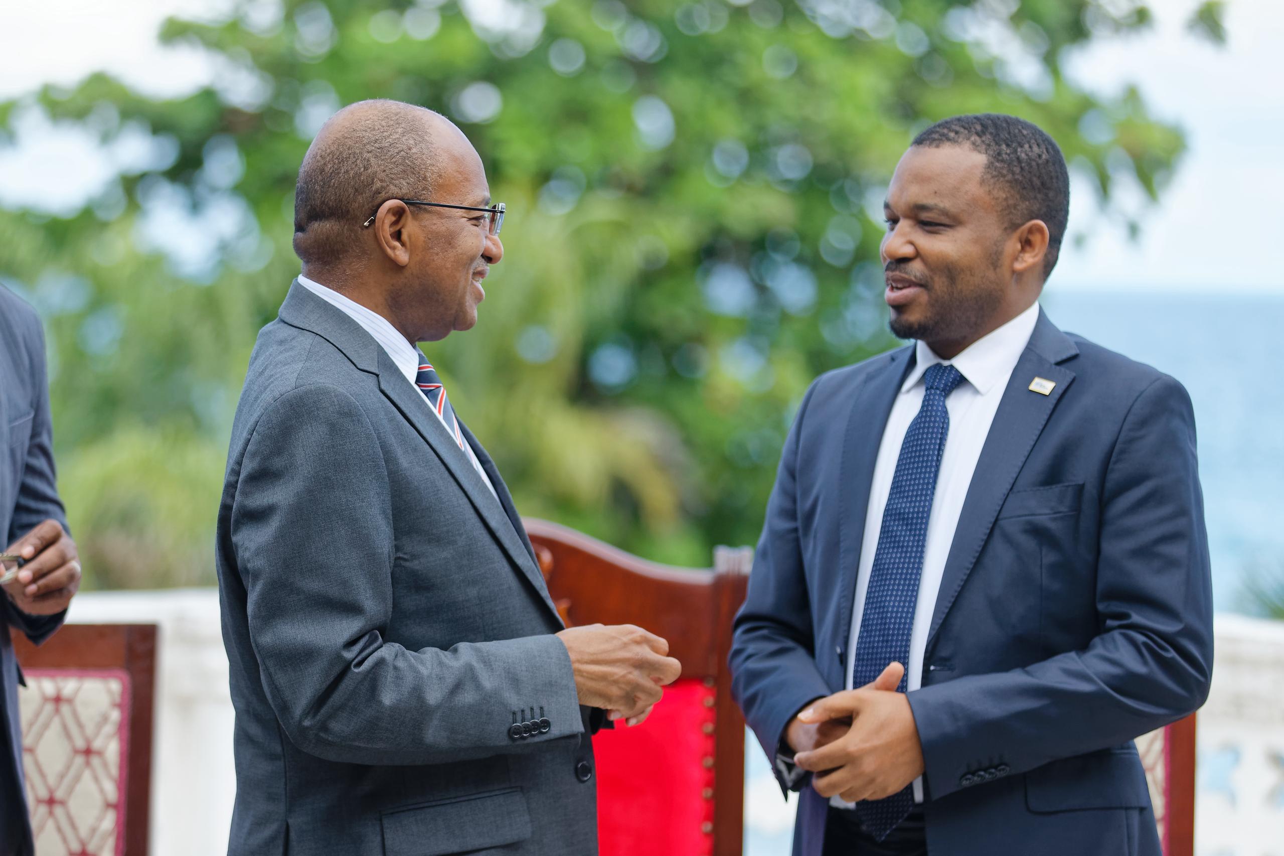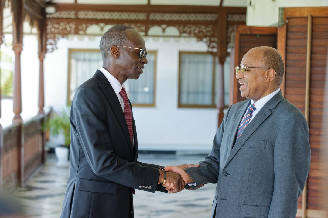 Rais wa Zanzibar na Mwenyekiti wa Baraza la Mapinduzi Dkt. Hussein Mwinyi akisalimiana na Mkurugenzi wa Shirika la Afya Duniani kwa Kanda ya Afrika, Profesa. Mohamed Yakub Janabi, Ikulu Zanzibar.