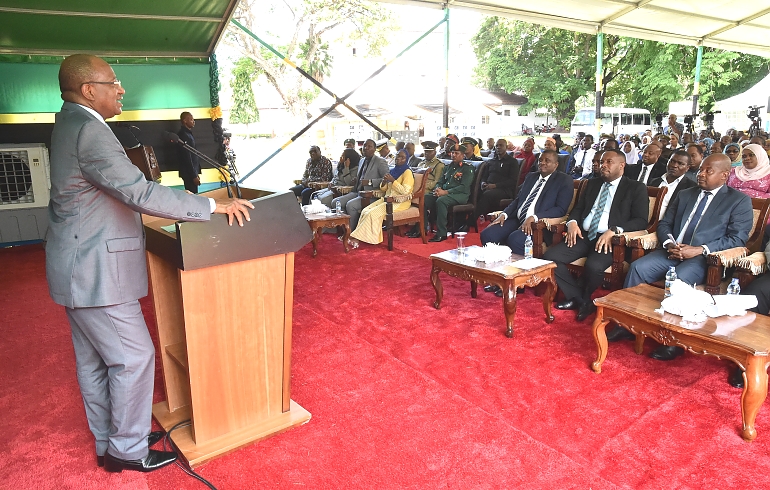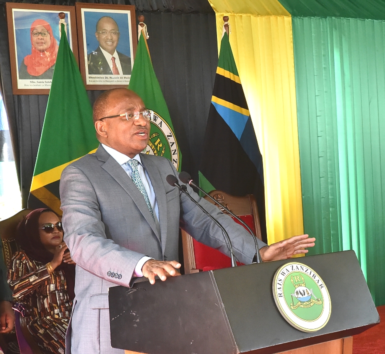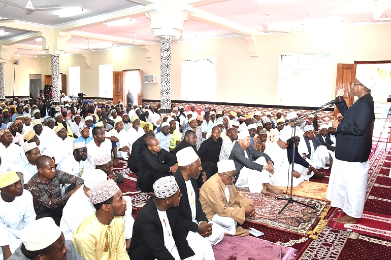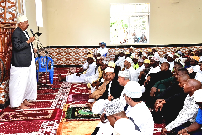 Rais wa Zanzibar na Mwenyekiti wa Baraza la Mapinduzi Alhaj Dk.Hussein Ali Mwinyi (kulia) alipokuwa akitoa hutuba yake mara baada ya Swala ya Ijumaa sambamba na Ufunguzi wa Masjid Istiqama katika Kijiji cha Mkwajuni Mkoa wa Kaskazini Unguja,ambapo ujenzi wake ulifanyika kwa ufadhili wa Sheikh, Suleiman Mohamed Yahya na Nguvu za Wananchi na Waumini wa Dini ya Kiislamu 13/01/2023.