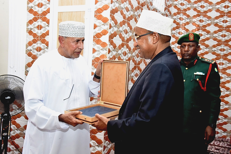 Rais wa Zanzibar na Mwenyekiti wa Baraza la Mapinduzi Alhaj Dk.Hussein Ali Mwinyi (kulia) akipokea zawadi kutoka kwa Bw.Suleiman Mohamed Yahya akiwa Mfadhili wa Ujenzi wa Masjid Istiqama katika Kijiji cha Mkwajuni Mkoa wa Kaskazini Unguja,ambapo ujenzi wake umefanyika kwa kushirikiana na Nguvu za Wananchi na Mfadhili huyo 13/01/2023.