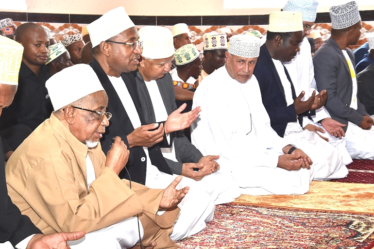 Rais wa Zanzibar na Mwenyekiti wa Baraza la Mapinduzi Alhaj Dk.Hussein Ali Mwinyi (katikati) pamoja na Viongozi wengine na Waumini wakiitikia dua iliyosomwa na Mufti Mkuu wa Zanzibar Sheikh Saleh Omar Kabi (kushoto)baada ya hafla ya Swala ya Ijumaa sambamba na Ufunguzi wa Masjid Istiqama katika Kijiji cha Mkwajuni Mkoa wa Kaskazini Unguja uliofanyika 13/01/2023