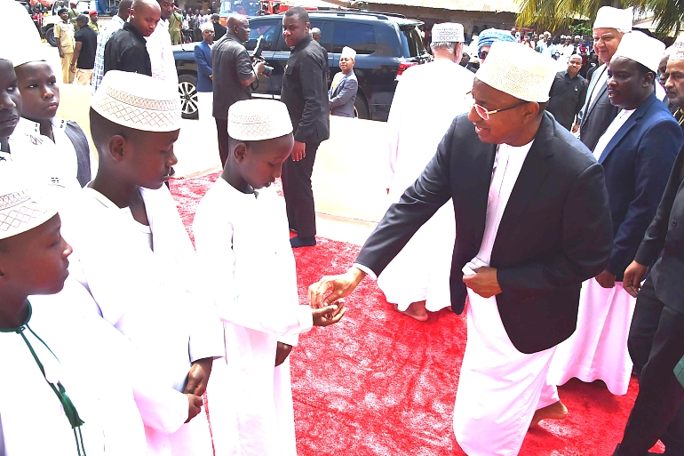 Rais wa Zanzibar na Mwenyekiti wa Baraza la Mapinduzi Alhaj Dk.Hussein Ali Mwinyi (kulia) alipokuwa kimpongeza Ramadhan Omar Mcha Wanamadrasa waliokuwa wakisoma Qaswida kwa Kumshindikiza Ufunguzi wa Masjid Istiqama katika Kijiji cha Mkwajuni Mkoa wa Kaskazini Unguja, hafla iliyofanyika leo ambapo Viongozi mbali mbali na Waumini walihudhuria katika sherehe hiyo 13/01/2023.