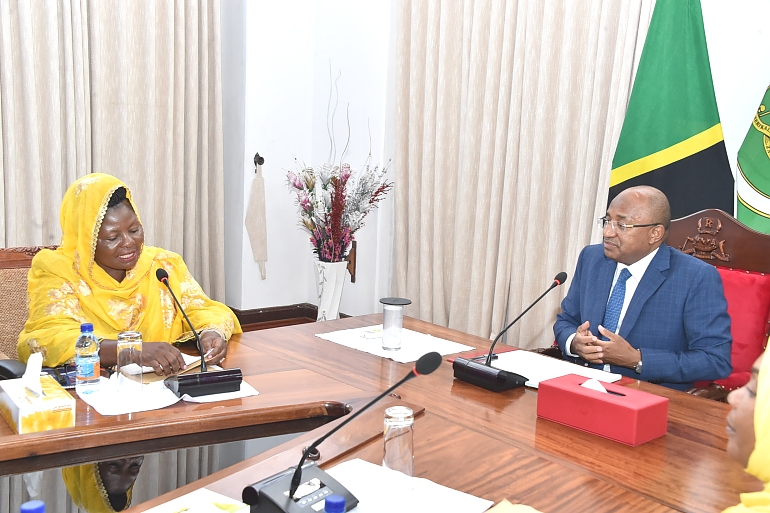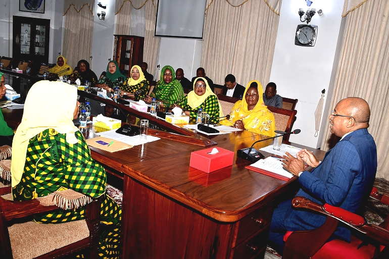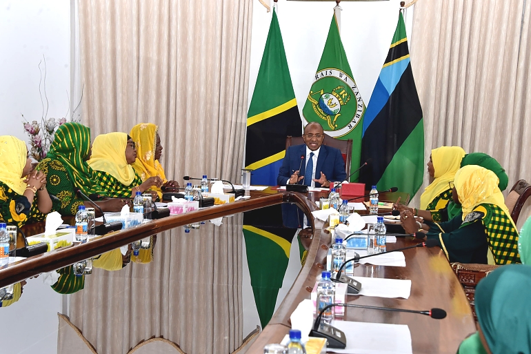 Rais wa Zanzibar na Mwenyekiti wa Baraza la Mapinduzi pia Makamo Mwenyekiti wa CCM Zanzibar Mhe.Dk. Hussein Ali Mwinyi (kulia) alipokuwa akizungumza na Viongozi wa Jumuiya ya Umoja wa Wanawake Tanzania wakiongozwa na Mwenyekiti pia Mjumbe wa Kamati Kuu ya CCM Taifa Mhe.Mary Chatanda (wa pili kulia) walipofika Ikulu Jijini Zanzibar 16/01/2023.