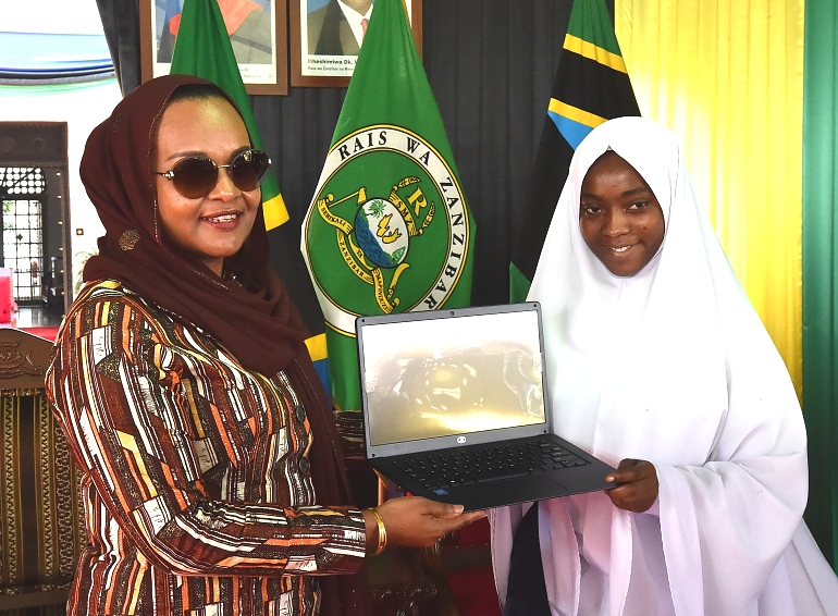 MKE wa Rais wa Zanzibar Mama Mariam Mwinyi akimkabidhi Komputa Mwanafunzi wa Skuli ya Sekondari ya Tumekuja Kidatu cha Nne Zakia Jaffar Hatib, kwa kufaulu Mtihani wake wa Taifa Kidatu cha Nne na kupata Daraja la kwanza.hafla hiyto iliyofanyika katika viwanja vya Ikulu leo 11-01-2023