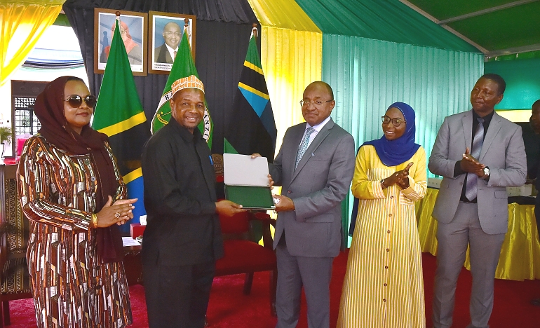RAIS wa Zanzibar na Mwenyekiti wa Baraza la Mapinduzi Mhe.Dk.Hussein Ali Mwinyi akimkabidhi Kishikwambi Afisa Mdhamani Wizara ya Elimu na Mafunzo ya Amali Pemba Bwa.Mohammed Nassor, kwa ajili ya matumizi ya Walimu wa Skuli za Msingi na Sekondari Pemba,(kulia) Mke wa Rais wa Zanzibar Mama Mariam Mwinyi na (kushoto kwa Rais) Waziri wa Elimu na Mafunzo ya Amali Zanzibar Mhe. Leila Mohammed Mussa na Waziri wa Elimu Sayansi na Teknolojia Tanzania Mhe. Prof.Adolf Mkenda,wakati wa hafdla ya kukabidhiwa Komputa (Laptop)kwa Wanafunzi wa Kidatu cha Sita na cha Nne waliofanya vizuri Mitihani yao kwa mwaka 2022, hafla hiyo iliyofanyika katika viwanja vya Ikulu Jijini Zanzibar leo 11-1-2023