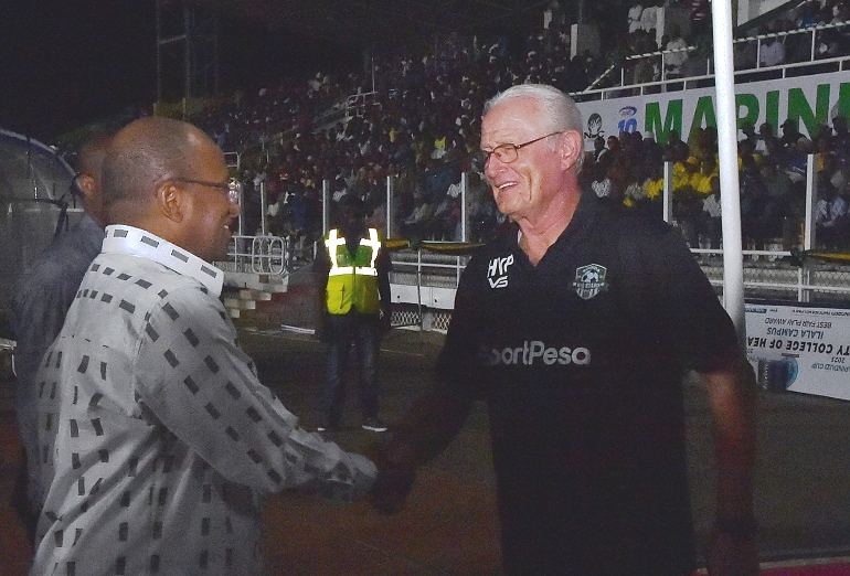 RAIS wa Zanzibar na Mwenyekiti wa Baraza la Mapinduzi Mhe.Dk.Hussein Ali Mwinyi akisalimiana na Kocha Mkuu wa Timu ya Singida Big Stars Hans Pluijm kabla ya kuaza kwa mchezo wa Fainali ya Kombe la Mapinduzi Cup 2023, dhidi ya Timu ya Mlandege mchezo uliofanyika jana usiku 13-1-2023, katika uwanja wa Amaan.Timu ya Mlandege imeshinda mchezo huo kwa bao 2-1
