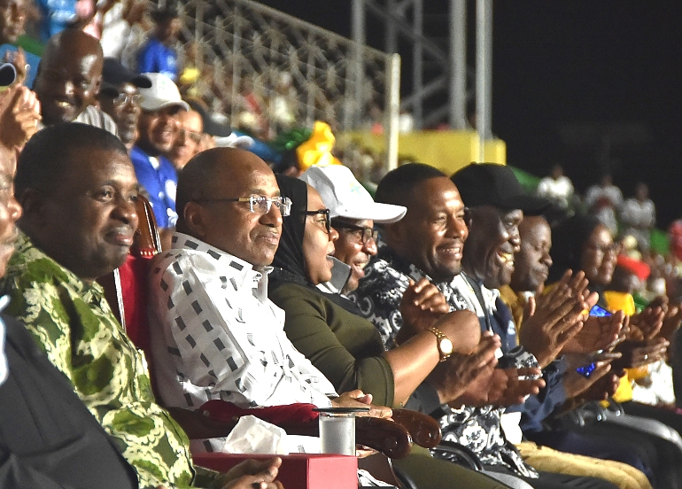 RAIS wa Zanzibar na Mwenyekiti wa Baraza la Mapinduzi Mhe.Dk.Hussein Ali Mwinyi akiwa na Viongozi mbalimbali wakishangilia Timu ya Mlandege baada ya kumalizika kwa mchezo wa Fainali,kati ya Timu ya Mlandege na Singida Big Stars, uliofanyika jana usiku 13-1-2023, katika Uwanja wa Amaan Wilaya ya Mjini Unguja.Timu ya Mlandege imeshinda mchezo huo kwa bao 2-1