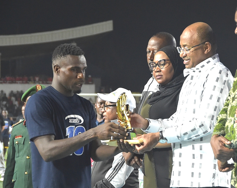 RAIS wa Zanzibar na Mwenyekiti Baraza la Mapinduzi Mhe.Dk.Hussein Ali Mwinyi na Makamu wa Pili wa Rais wa Zanzibar Mhe. Hemed Suleiman Abdulla, wakishuhudia Waziri wa Habari,Vijana Utamaduni na Michezo Zanzibar Mhe.Tabia Maulid Mwita akimkabidhi zawadi Mfungaji Bora wa Michuano ya 17 Kombe la Mapinduzi Cup 2023 kutoka Timu ya Singida Big Stares. Fancy Kazadi,baada ya kumalizika kwa mchezo wa Fainali ya Kombe la Mapinduzi Cup, kati ya Mlandege na Singida uliofanyika Uwanja wa Amaan Unguja
