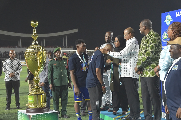 RAIS wa Zanzibar na Mwenyekiti wa Baraza la Mapinduzi Mhe.Dk.Hussein Ali Mwinyi akimvisha Medali ya Dhahabu Mchezaji wa Timu ya Mlandege Mabingwa wa Kombe la Mapinduzi Cup 2023, baada ya kuifunga Timu ya Singida Big Stars katika mchezo wa Fainali uliyofanyika katika Uwanja wa Amaan Wilaya ya Mjini Unguja jana usiku 13-1-2023. Kwa bao 2-1
