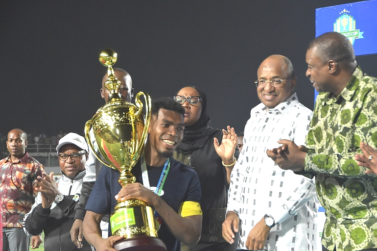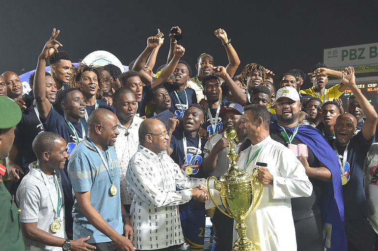 Rais wa Zanzibar Mhe.Dk.Hussein Mwinyi akabidhi Kombe la Mapinduzi kwa Bingwa Timu ya Mlandege.
