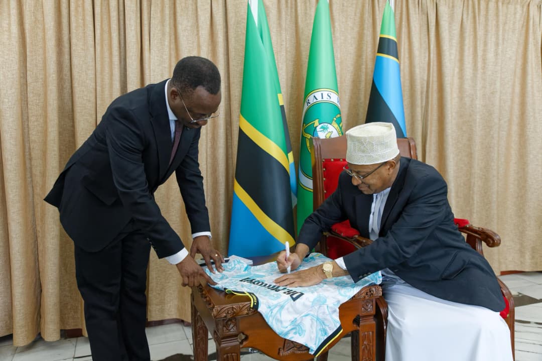 Rais wa Zanzibar na Mwenyekiti wa Baraza la Mapinduzi Dkt.Hussein Ali Mwinyi akisaini Jezi baada ya kuzungumza wakati alipokutana na timu ya wataalamu wa masuala ya fedha kutoka Taasisi ya Tanzania Securities Limited, iliyoongozwa na Mkurugenzi Mtendaji wake, Ndg. George Shumbusho, waliofika Ikulu, Zanzibar.