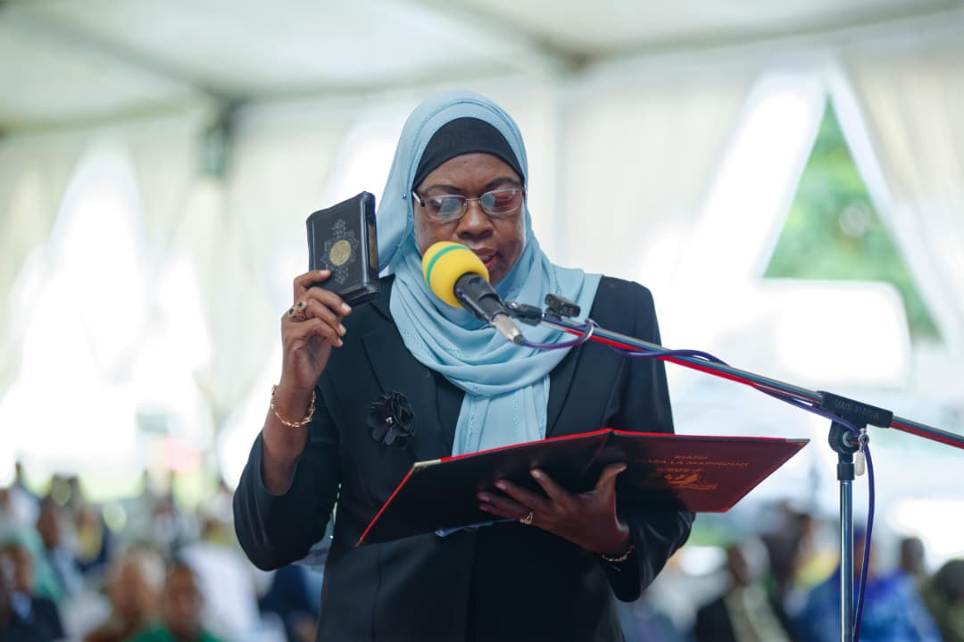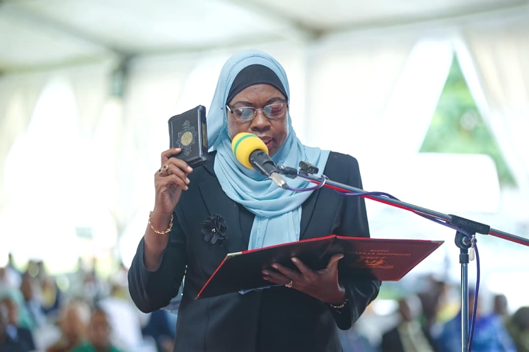 .Rais wa Zanzibar na Mwenyekiti wa Baraza la Mapinduzi, Mhe. Dkt. Hussein Ali Mwinyi, akimuapisha Salama Mbarouk Khatibu kuwa Katibu Mkuu Wizara ya Vijana Ajira na Uwezeshaji kabla ya Uteuzi huo Bi Salama Mbarouk Khatib alikuwa Mkuu wa Mkoa wa Kaskazini Pemba.