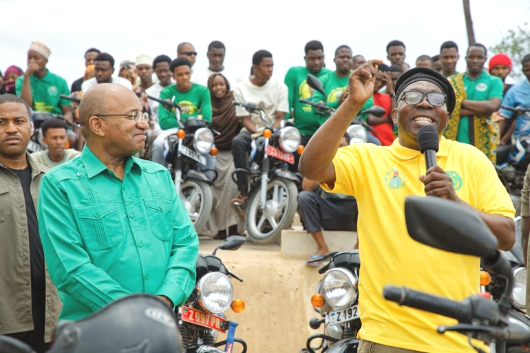 Mgombea wa kiti cha Rais wa Zanzibar kupitia Chama Cha Mapinduzi, ambaye pia ni Rais wa Zanzibar na Mwenyekiti wa Baraza la Mapinduzi, Mhe. Dkt. Hussein Ali Mwinyi, akimsikiliza Mjasiriamali wanaoendesha boda bodawakati alipoyatembelea makundi hayo pamoja na wakulima wa mazao ya viungo katika Shehia ya Mndo, Wilaya ya Magharibi A, Mkoa wa Mjini Magharibi.