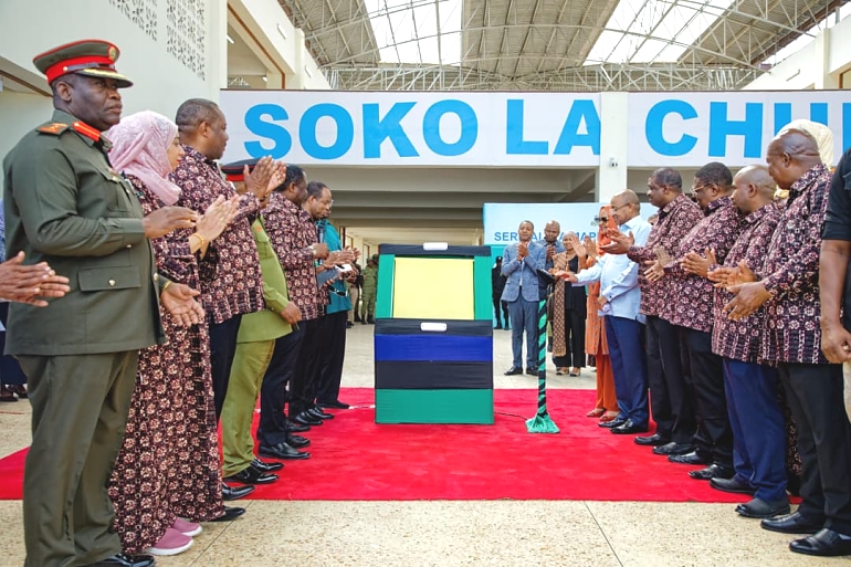 Mhe. Dkt. Hussein Ali Mwinyi, wakati amefungua rasmi Soko na Kituo cha Mabasi cha Kisasa Chuini, Wilaya ya Magharibi A, Mkoa wa Mjini Magharibi le