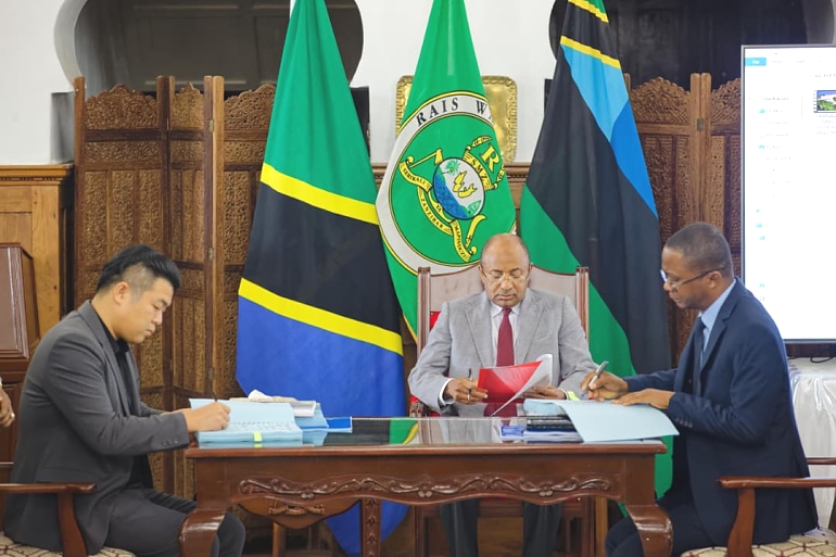 Rais Dkt. Mwinyi akishughudia utiaji wa saini wa mkataba wa ujenzi, ukarabati na upanuzi wa Hospitali ya Mnazi Mmoja kati ya Serikali ya Mapinduzi ya Zanzibar na Kampuni ya Jiangxi International Econo