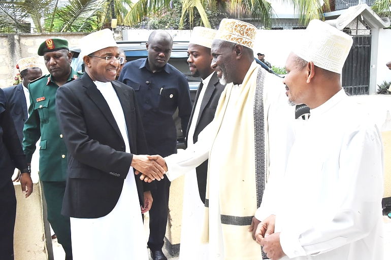 Rais wa Zanzibar na Mwenyekiti wa Baraza la Mapinduzi Alhaj Dk.Hussein Ali Mwinyi (kushoto) akisalimiana na Viongozi alipowasili katika Masjid Al- Rahmah Mombasa,Mkoa wa Mjini Magharibi leo alipojumui