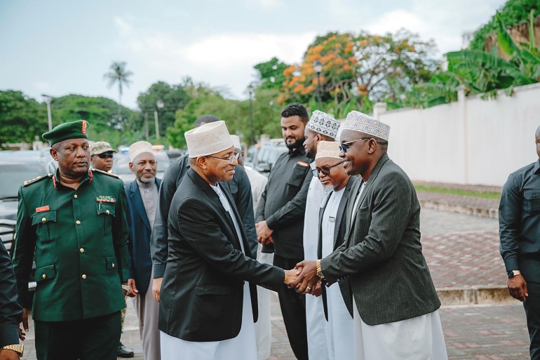 Rais wa Zanzibar na Mwenyekiti wa Baraza la Mapinduzi, Alhaj. Dkt. Hussein Ali Mwinyi, akisalimiana na Viongozi pamoja na wananchi mbalimbali katika mazishi ya aliyekuwa Mkuu wa Mkoa Mstaafu wa Mkoa wa Mjini Magharibi, Marehemu Abdalla Mwinyi Khamis, ambaye alifariki dunia jana akiwa hospitalini. Marehemu Abdallah Mwinyi alifariki wakati akipatiwa matibabu katika Hospitali ya Rufaa ya Mkoa wa Lumumba.