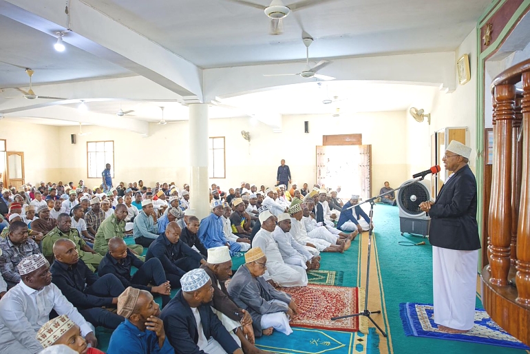 Rais wa Zanzibar na Mwenyekiti wa Baraza la Mapinduzi, Alhaj Dkt. Hussein Ali Mwinyi, akiwahutubia Waumini wa Dini ya Kiislam baada ya kumalizika kwa Swala ya Ijumaa katika Masjid Rashidin, Dole Sokoni, Mkoa wa Mjini Magharibi na kuwasisitiza Waumini hao kuendelea kuiombea Nchi Amani leo tarehe 21 Septemba, 2025