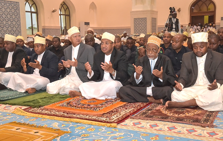 RAIS wa Zanzibar na Mwenyekiti wa Baraza la Mapinduzi Alhajj Dk.Hussein Ali Mwinyi akishiriki kuitikia dua ikisoma na Hatibu Sheikh.Ally Abdurahaman Al Hilaal,(hayupo pichani) baada kwa Hutuba ya Sala ya Eid El Fitry iliyofanyika katika Masjid Jamiu Zinjibar Mazizini Wilaya ya Magharibi “B” Unguja leo 22-4-2023, na (kushoto kwa Rais) Mufti Mkuu wa Zanzibar Sheikh Saleh Omar Kabi na Katibu Mtendaji wa Ofisi ya Mufti Mkuu wa Zanzibar Sheikh. Khalid Ali Mfaume na (kulia kwa Rais) Waziri wa Nchi Ofisi ya Rais,Katiba, Sheria,Utumishi na Utawala Bora Zanzibar Mhe. Haroun Ali Suleiman na Makamu wa Kwanza wa Rais wa Zanzibar. Alhajj Othman Masoud Othman na Makamu wa Pili wa Rais wa Zanzibar Mhe. Hemed Suleiman Abdulla