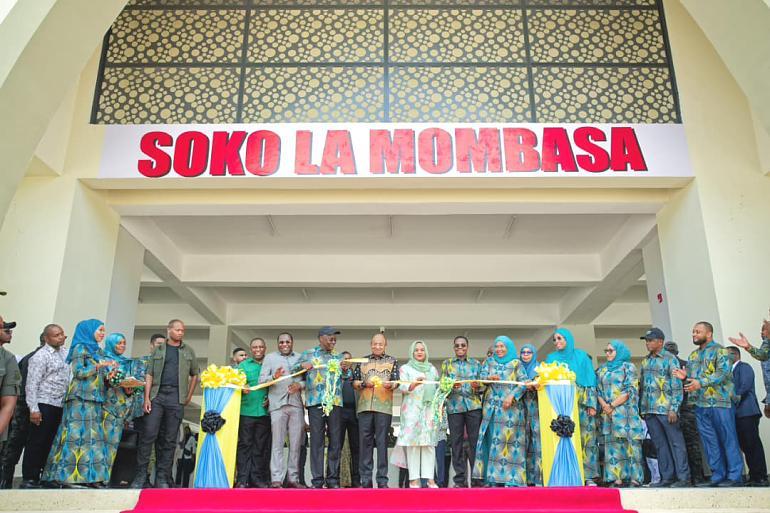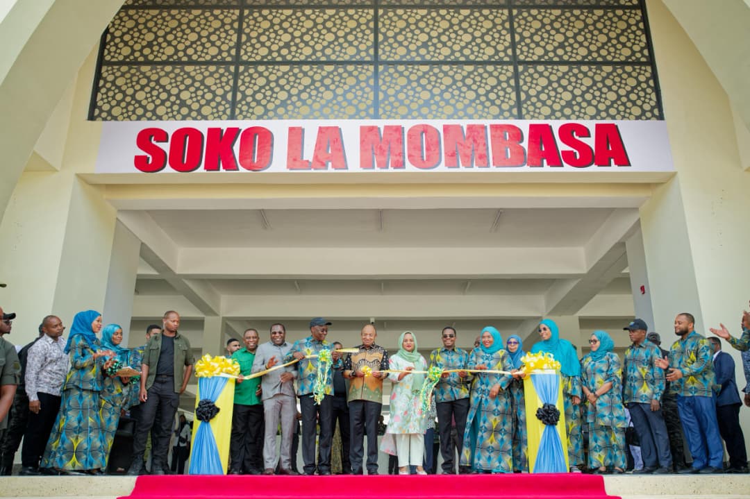 Rais wa Zanzibar na Mwenyekiti wa Baraza la Mapinduzi, Dkt. Hussein Ali Mwinyi, akikata utepe kuashiria uzinduzi wa soko la kisasa la mboga mboga liliopo Mombasa Wilaya ya Magharib “B” Mkoa wa Mjini