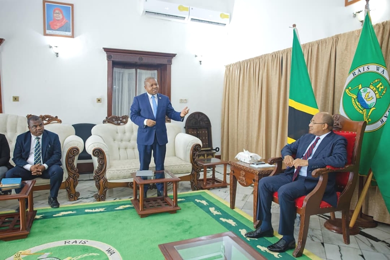 Rais wa Zanzibar na Mwenyekiti wa Baraza la Mapinduzi Dkt. Hussein Ali Mwinyi akizungumza na Kamishna Mkuu wa TRA, Ndg. Yussuf Juma Mwenda, pamoja na baadhi ya watendaji wakuu wa Mamlaka hiyo, waliofi