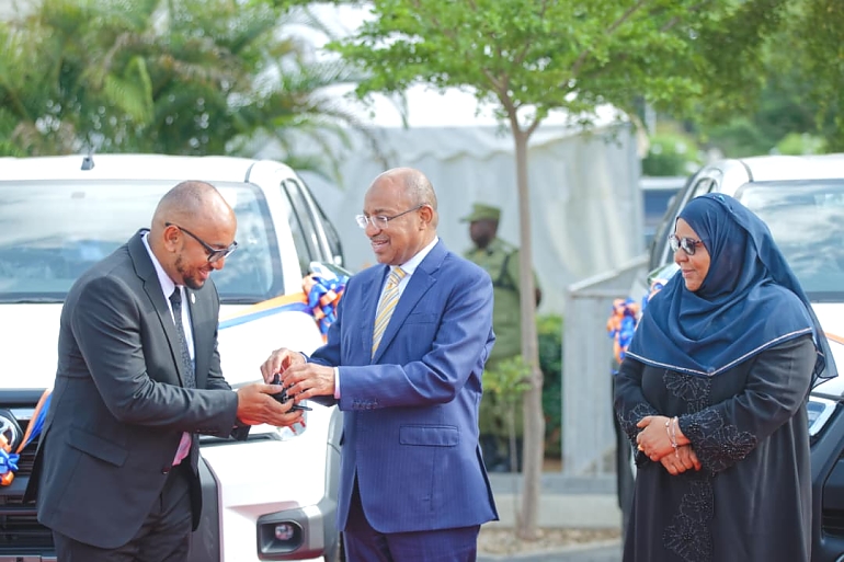 Rais wa Zanzibar na Mwenyekiti wa Baraza la Mapinduzi, Mhe. Dkt. Hussein Ali Mwinyi, akikabidhiwa Fungua za Nyumba na Mkurugenzi Mtendaji wa Shirika la Nyumba Zanzibar ZHC mara tu baada ya uzinduzi wa