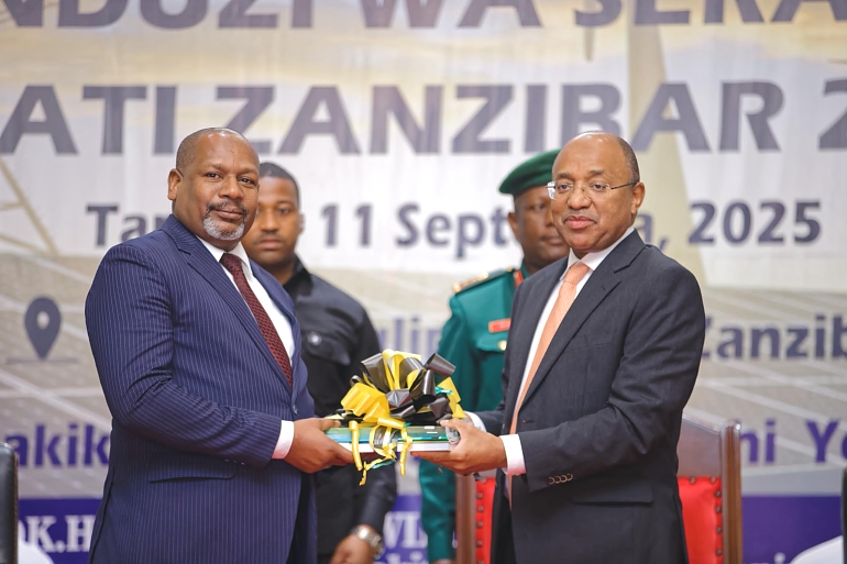 Rais wa Zanzibar na Mwenyekiti wa Baraza la Mapinduzi, Mhe. Dkt. Hussein Ali Mwinyi akimkabidhi Katibu Mkuu Ofisi ya Rais Ikulu ndugu Saleh Juma Mussa Vitabu vya Sera ya Nishati ya Zanzibar ya 2025 pamoja na Mpango Mkuu wa Umeme wa Zanzibar wa 2025–2040, katika hafla iliyofanyika Hoteli ya Golden Tulip, Mkoa wa Mjini Magharibi, Unguja leo tarehe 11 Septemba 2025.