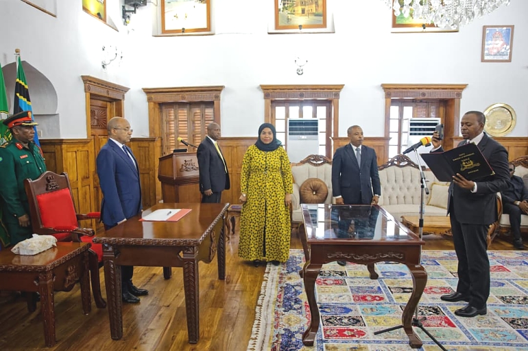 Rais wa Zanzibar na Mwenyekiti wa Baraza la Mapinduzi, Mhe. Dkt. Hussein Ali Mwinyi, akimuapisha Dkt. Mwinyi Talib Haji kuwa Mwanasheria Mkuu wa Zanzibar.Hafla ya uapisho imefanyika leo tarehe 6 Novemba 2025, Ikulu, Zanzibar.Dkt. Mwinyi Talib Haji ameteuliwa tena kushika nafasi hiyo baada ya kuitumikia katika kipindi kilichopita.