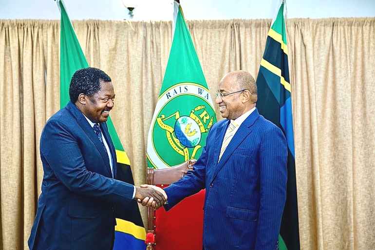 Rais wa Zanzibar na Mwenyekiti wa Baraza la Mapinduzi, Mhe. Dkt. Hussein Ali Mwinyi, akisalimiana na Makamu wa Rais wa Jamhuri ya Muungano wa Tanzania, Dkt. Emmanuel John Nchimbi, aliyefika Ikulu kujitambulisha rasmi. na pia Dkt. Mwinyi amempongeza Dkt. Nchimbi kwa kushika wadhifa huo na kumhakikishia ushirikiano wa kiwango cha juu katika utekelezaji wa masuala yote yanayohusu Muungano.