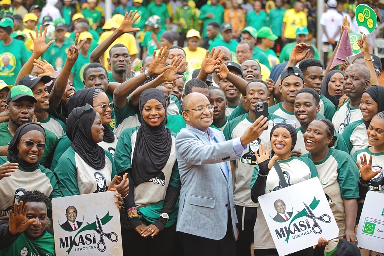Rais wa Zanzibar na Mwenyekiti wa Baraza la Mapinduzi, Mhe. Dkt. Hussein Ali Mwinyi, akiwa katika picha ya pamoja na wanachama na wapenzi wa Chama cha Mapinduzi wakati wa uwekaji wa jiwe la msingi la ujenzi wa jengo la huduma za akina mama na watoto katika Hospitali ya Makunduchi, Mkoa wa Kusini Unguja leo tarehe 27 Octoba, 2025.