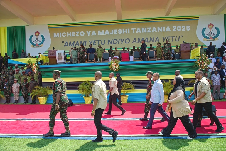 Rais wa Zanzibar na Mwenyekiti wa Baraza la Mapinduzi, Mhe. Dkt. Hussein Ali Mwinyi, akiwasili katika Uwanja wa Mao Tse Tung kwa ajili ya kufungua Michezo ya Majeshi ya Tanzania 2025 ambeambatana na Mkuu wa Majeshi ya Ulinzi (CDF) Jenerali John Jacob Mkunda, pamoja na viongozi wa Serikali na vyombo vya ulinzi na usalama.