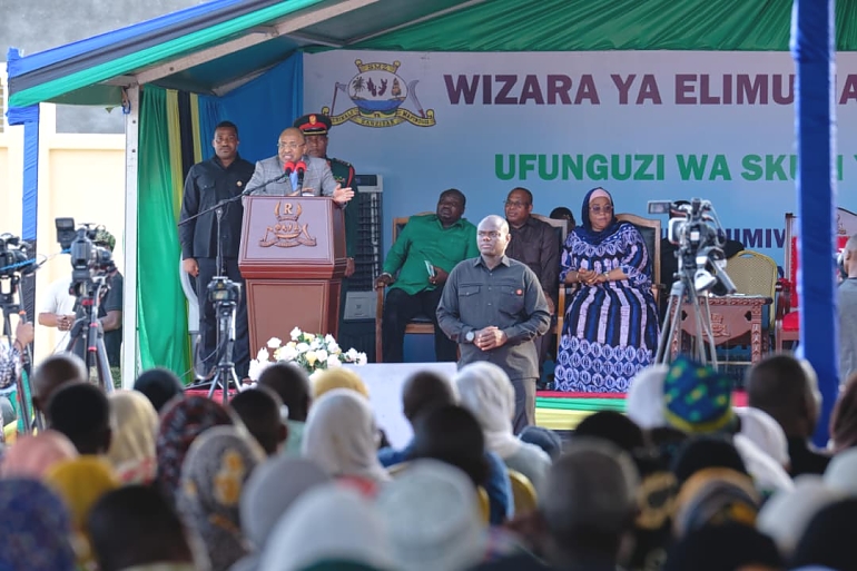 Rais wa Zanzibar na Mwenyekiti wa Baraza la Mapinduzi, Mhe. Dkt. Hussein Ali Mwinyi, akizungumza leo, tarehe 27 Disemba 2025, alipoifungua Skuli Mpya ya Msingi ya Muungano iliyopo Kibanda Maiti, Mkoa