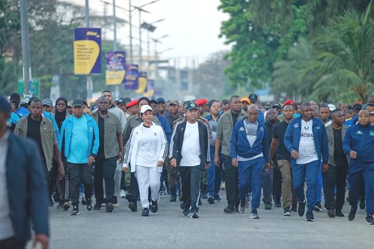 Rais wa Zanzibar na Mwenyekiti wa Baraza la Mapinduzi, Mhe. Dkt. Hussein Ali Mwinyi, pamoja na Mkewe Mama Mariyam Mwinyi wakishiriki katika Bonanza la 16 la Mazoezi ya Viungo lililoandaliwa na Chama c