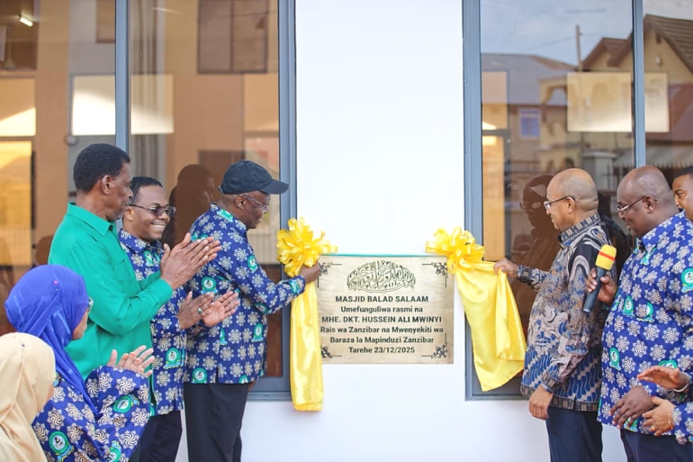 Rais wa Zanzibar na Mwenyekiti wa Baraza la Mapinduzi, Mhe.Dkt. Hussein Ali Mwinyi, akifungua kipazia kuonyesha ishara ya kuzindua rasmi Mji wa Dkt. Hussein Mwinyi uliopo Mombasa, Mkoa wa Mjini Magharibi, na kuutaka Mfuko wa Hifadhi ya Jamii Zanzibar (ZSSF) kuendelea kujikita katika utekelezaji wa miradi mikubwa yenye tija kwa maendeleo ya Taifa