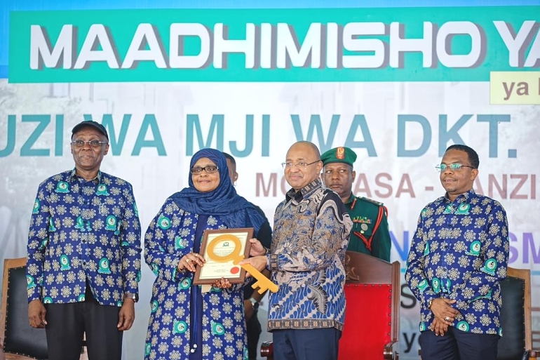 Rais wa Zanzibar na Mwenyekiti wa Baraza la Mapinduzi, Mhe.Dkt. Hussein Ali Mwinyi,akimkabidhi funguo na cheti mwananchi ambae amenunua miongoni mwa nyumba hizo zilizojengwa na Mfuko wa Jamii wa ZSSF