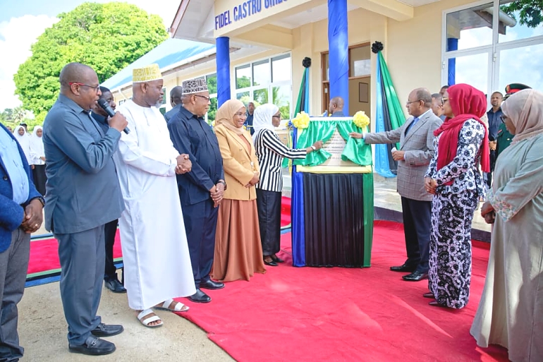 Rais wa Zanzibar na Mwenyekiti wa Baraza la Mapinduzi Zanzibar Mhe:Dkt.Hussein Ali Mwinyi akiandoa kipazia kuashiria uzinduzi wa Dakhalia ya wasichana ya Skuli ya Fidel Castro umegharimu shilingi bilioni 1.5 na ina uwezo wa kuchukua wanafunzi 288, kwa wastani wa wanafunzi 28 kwa kila darasa. Mradi huu wa Dakhalia ya wanafunzi wa kike wa Skuli ya Fidel Castro ndio wa kwanza kufunguliwa na Rais Dkt. Mwinyi kisiwani Pemba tangu kuchaguliwa tena kuiongoza Zanzibar kwa kipindi cha pili cha Awamu ya Nane.