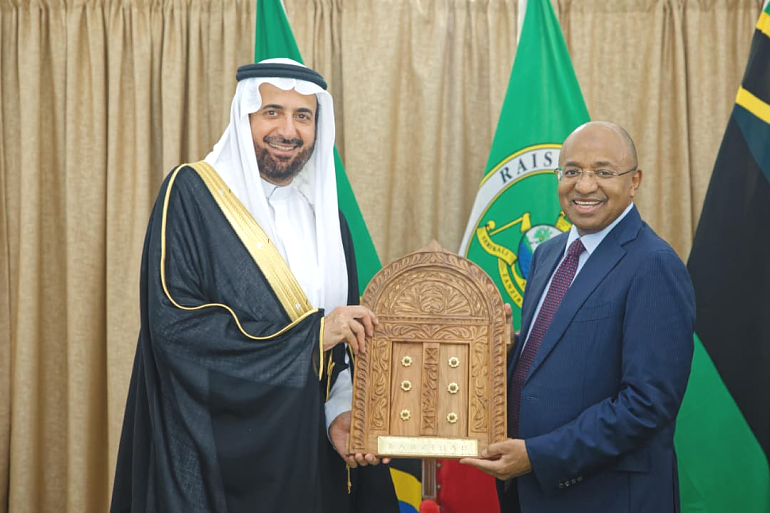• Rais wa Zanzibar na Mwenyekiti wa Baraza la Mapinduzi Dkt.Hussein Ali Mwinyi akimkabithi zawadi ya mlango wa Zanzibar (Zanzibar door) Waziri wa Hijja na Umrah wa Saudi Arabia, Mhe. Tawfiq bin Fawzan A