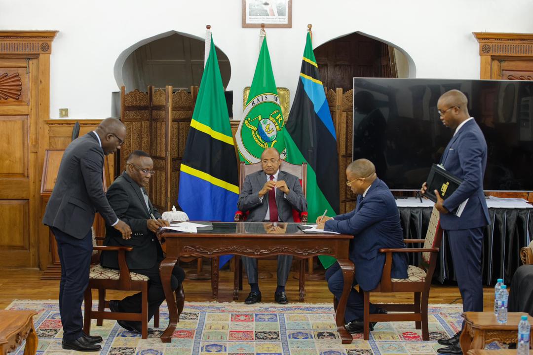 Rais wa Zanzibar na Mwenyekiti wa Baraza la Mapinduzi Dkt .Hussein Ali Mwinyi akishuhudia utiaji wa Saini wa Mikataba inahusisha ujenzi wa miradi mitatu mikubwa ya kimkakati ambayo ni Ujenzi wa Taasisi ya Saratani Binguni, Mradi wa Usambazaji Maji Mkoa wa Kusini Unguja, na Mradi wa Mfumo Jumuishi wa Usimamizi na Usajili wa Huduma za Ardhi Zanzibar (LARIS).